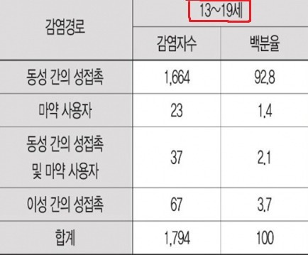 13~19세 청소년 에이즈 환자의 92%가 동성간 성접촉으로 일어 납니다.