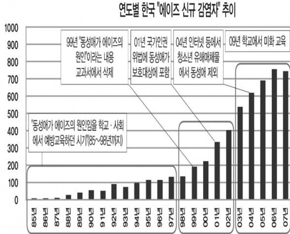 도표를 보시면 나오지만, 99년 김대중 정부때 동성애가 에이즈의 원인이라는 내용이 교과서에서 삭제되고