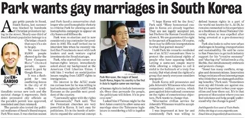 박원순 시장 본인은 부정하지만 미 언론에서 "한국이 동성결혼을 하는 아시아 첫 국가가 되길 희망한다"라는 기사가 나옵니다.