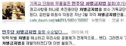 한기총의 저항에 민주당과 진보정당 소속 의원들이 발의한 차별금지법이 번번히 막히고 있기 때문입니다.